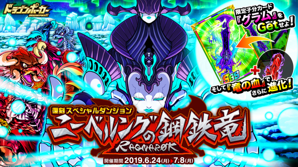 株式会社アソビズム(本社:東京都千代田区、代表取締役:大手智之)は、App Store・Google Playにて好評配信中のリアルタイム合体カードバトル『ドラゴンポーカー』で、2019年6月24日(月)より復刻スペシャルダンジョン「ニーベルングの鋼鉄竜RAGNAROK」を開催いたします。今回のダンジョンでは、「ファーゾルト(竜)」や「ラグナロク」がボスモンスターとして登場!前回の開催期間中に『ドラゴンポーカー』をまだプレイできなかった方も、復刻開催する本ダンジョンをお楽しみください。