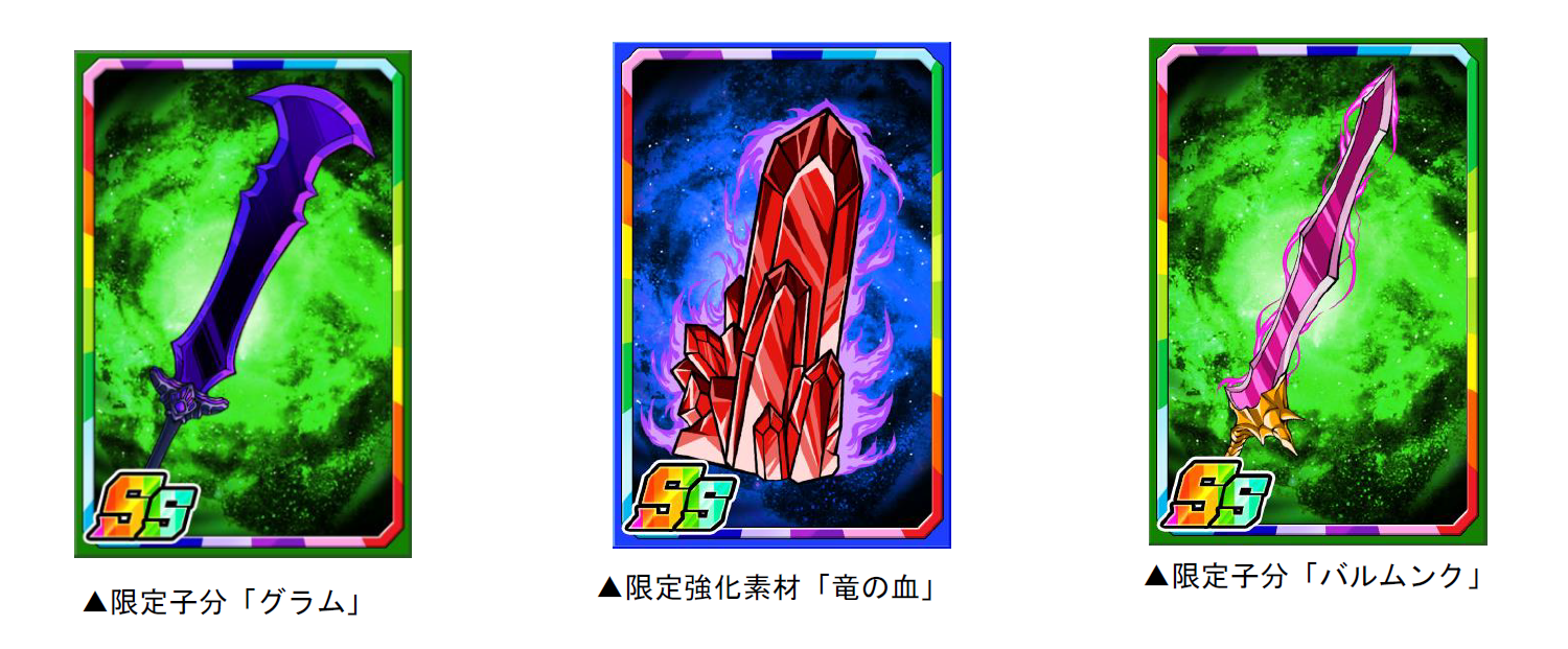「ニーベルングP」を貯めると、ポイントと交換で限定子分「グラム」「バルムンク」が手に入ります。「グラム」と「バルムンク」は、ダンジョンのボスを倒すとまれに手に入ることがある「竜の血」を使って進化させることができます。また、「竜の血」は、全てのスキルレベル上昇確率がアップする強化素材としても使用可能。ダンジョンに立ちはだかるボスを倒し、「竜の血」をたくさん集めましょう!