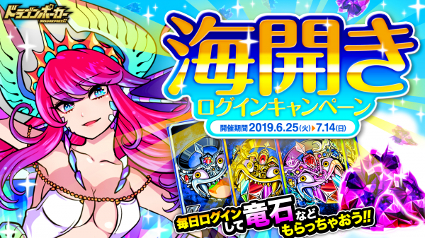 株式会社アソビズム(本社:東京都千代田区、代表取締役:大手智之)は、App Store・Google Playにて好評配信中のリアルタイム合体カードバトル『ドラゴンポーカー』で、2019年6月25日(火)より「海開きログインキャンペーン」を開催いたします。期間中、15日間ログインすると、「竜石」が最大30個もらえる「海開きログインキャンペーン」を開催いたします。5日ログインごとに「深海の指輪」や「海神の指輪」など豪華アイテムをプレゼント!『ドラゴンポーカー』に毎日ログインして、豪華プレゼントを受け取りましょう!