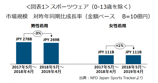 直近1年間計(2018年5月~2019年4月)のスポーツアパレル(0-13歳着用を除く)の日本における市場規模は3800億円で対前年同期比 2%減とマイナス成長でした。これはスポーツアパレル市場( 着用者0-13歳を除く)の70%超を占める着用者男性がマイナス成長(-3%)だったことに起因します。女性着用は、対前年同期比1%増とプラス成長でした(図表1)。
