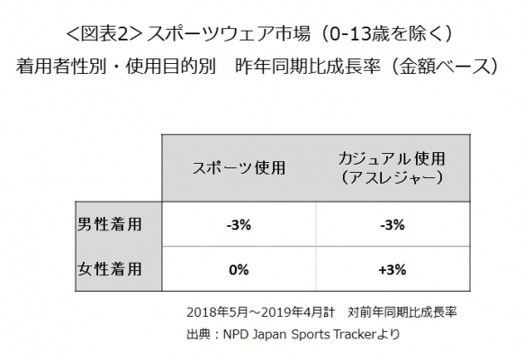 直近1年間計(2018年5月~2019年4月計)で着用目的※2別に対前年同期比成長率を見ると(図表2)、男性着用ではスポーツ使用目的、アスレジャー(カジュアル使用目的)共にマイナス成長でした。女性着用ではスポーツ使用は横ばいでしたが、アスレジャーでは +3%成長しました。女性着用のアスレジャーは、1年前(2017年5月~2018年4月計)の対前年同期比もプラス成長(+4%)で、2年連続成長しました。