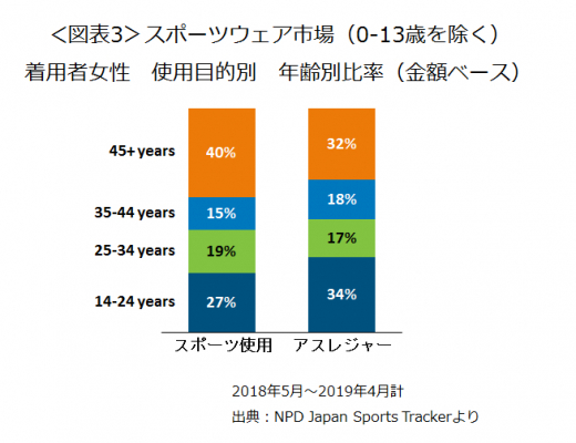 直近1年間(2018年5月~2019年4月)の女性着用のスポーツウェア市場(着用者0-13歳を除く 金額ベース)の年代別比率を見ると、アスレジャーでは14-24歳が34%で、最も比率が大きい年代でした(図表3)。スポーツ着用目的の同27%よりも7ポイント大きくなっています。