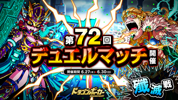 株式会社アソビズム(本社:東京都千代田区、代表取締役:大手智之)は、App Store・Google Playにて好評配信中のリアルタイム合体カードバトル『ドラゴンポーカー』で、2019年6月27日(木)より「第72回デュエルマッチ本戦」を開催いたします。今回のルールは「殲滅戦」です。デュエルマッチでは、バトルで獲得できる「デュエルP」に応じてランキングが決まり、リーグ終了時に報酬が獲得できます。また、累計勝利数に応じて、限定カードも手に入ります。相手の心理を読み、1vs1の真剣勝負に挑みましょう!