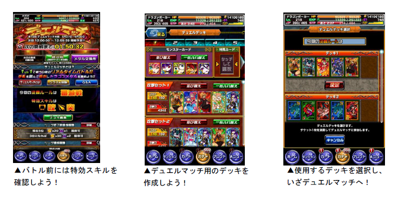 デュエルマッチでは、通常よりも高い効果を発揮する「特効スキル」が設定されています。今回の「デュエルマッチ」の特効スキルは、咬・突です。特効スキルのカードをデッキに入れて、有利にバトルを勝ち進めましょう。