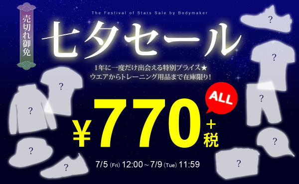 スポーツブランド「BODYMAKER」は、日頃のお客様からのご愛顧に感謝を致しまして、2019 年7 月5 日(金)~ 7 月9 日(火)の期間、年に一度の「七夕セール」を開催いたします。
