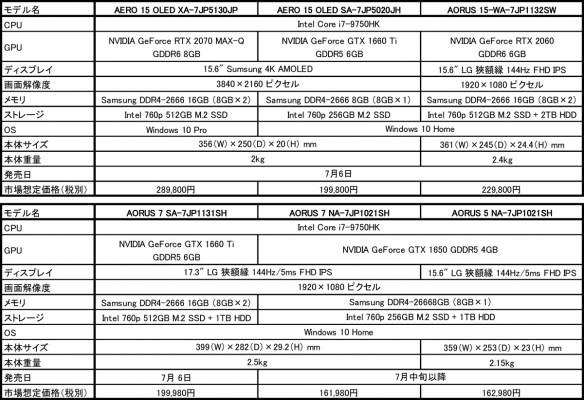 今回発売するAERO 15 OLEDシリーズとAORUS新モデルの主な仕様、発売日および市場想定価格(税別)は以下のとおりです。