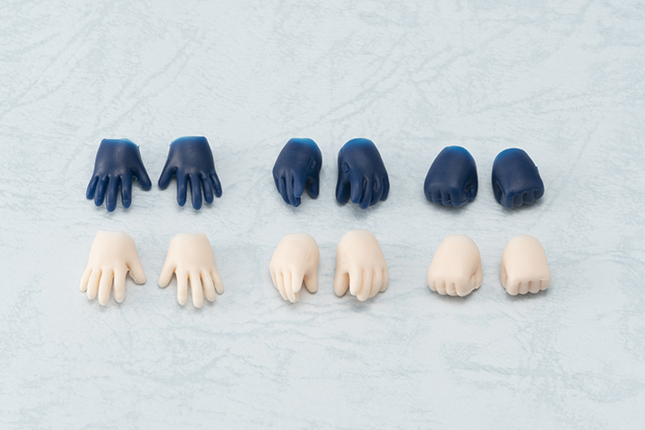 着せ替えも楽しんでいただけるよう、手袋をイメージした青いハンドパーツの他に、肌色のハンドパーツも付属します。
