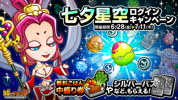 6月28日(金)より、ゲームにログインするだけで無料ごはん中盛り券やシルバーパスなどがもらえる「七夕星空ログインキャンペーン」を開催いたします。期間中、ゲームにログインすると最大12日間、CPやトロPなどの豪華報酬が1日1回もらえます。
