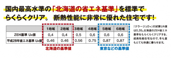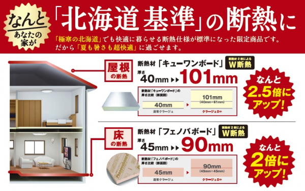 「クラージュ D+」は、屋根の断熱材「キューワンボード」を2.5倍に、床の断熱材「フェノバボード」を2倍にアップして断熱仕様を高めた「クラージュ」シリーズの夏の期間限定商品です。改正省エネルギー基準地域 1~2地域の平成28年省エネ基準UA値0.46や、国全体で普及促進を進めているZEH対応住宅の基準UA値0.4という、国内最高水準の「北海道の省エネ基準」を標準でクリアする優れた断熱効果を発揮し、近年では猛暑・酷暑や熱帯夜が続く夏でも家全体をより快適な空間に保つことができます。