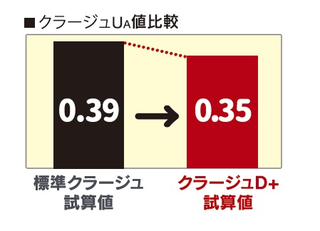 UA値とは外皮平均熱貫流率のことで、この数値が小さいほど断熱性に優れています。「クラージュD+」のUA値試算値は0.35と、標準クラージュの試算値0.39と比較して大幅に改善されました。