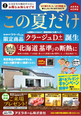 また、今回の「クラージュ D+」誕生を記念してアエラホームでは一部パートナー店舗を除いて、外張W断熱住宅「クラージュ」「プレスト」をご契約いただいた全店合計先着50組様を対象に、「太陽光発電システム」「小屋裏スペース」「全館空調換気システム」の中からお好きな設備を1つ選べるプレゼントキャンペーンを実施いたします。さらに、各支店の来場者を対象に、先着20組様に来場者プレゼントとして、「黒毛和牛800g」「エビスビール 350ml 24本」「ドトール氷deアイスカフェオレ&氷deアイスロイヤルミルクティー 各3箱」の3つの中からお好きなもの1つをプレゼントする特別キャンペーンを同時開催いたします。