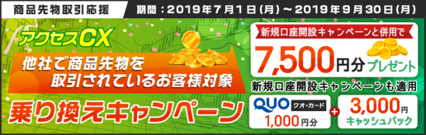 他社で商品先物を取引されているお客様が、期間中に当社商品先物オンライントレード(アクセスCX)口座を開設し、20枚以上の新規取引でもれなく3,500円をキャッシュバックいたします。