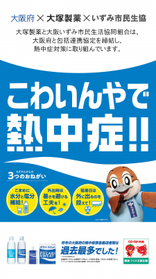 2018年の大阪府の熱中症緊急搬送者は7,138人(うち死亡者は12人)で、2008年の調査開始以降、過去最多でした。これを受けて、大阪府と大塚製薬株式会社、いずみ市民生協は、熱中症対策にとりくんでいます。