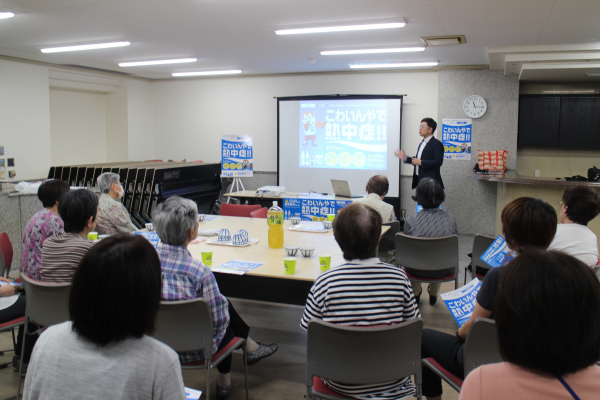 移動販売車「コープのお買物便」の停留所や高齢者の方が集まるサロンなどにて、大塚製薬株式会社による熱中症対策セミナーを開催しています。2019年度は11会場で約300人が参加予定です。(昨年は14会場187人が参加)