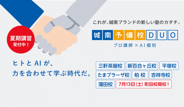 株式会社城南進学研究社(本社:神奈川県川崎市・代表取締役:下村勝己)は、多様化する進路選択・入試制度への対応を可能とする『城南予備校DUO町田校』を、7月13日(土)、東京都町田市に開校します。今開校は三軒茶屋校、新百合ヶ丘校、平塚校、柏校、たまプラーザ校、吉祥寺校、蒲田校に続き8校舎目です。