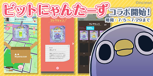 株式会社インクルーズ(東京都渋谷区、代表取締役 山崎 健司)は、7月5日(金)より当社が提供するLINEスタンプ「面倒だがトリあえず返信」から生まれた「めんトリ」と、リアルワールドゲームス株式会社(東京都中央区、代表取締役社長 清古 貴史)が配信している「ビットにゃんたーず」とのコラボが開始されることをご報告させていただきます。