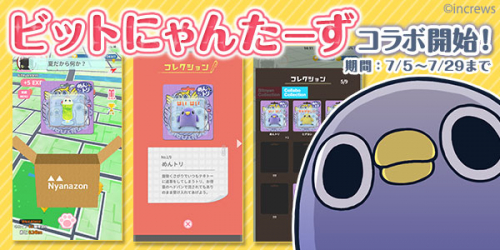 今回コラボさせていただきます、「ビットにゃんたーず」は、現実世界を歩いて様々な冒険をする位置情報ゲーム。どんどん歩くことで、街の新しい発見や健康の維持につながるゲームとなっております。「めんトリ」はコラボアイテムとして登場。街を歩いてスペシャルな「めんトリ」のコラボアイテムを手に入れましょう。