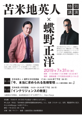 対する苫米地会長は、防災、防犯、危機管理に深い知識を持つ稀有な脳科学者であり、スマートフォンによる情報過多な現代に警鐘を鳴らす。スマートフォンを介したメディアの戦略は多様化され、市民らの思考を統制し、経済的搾取が行われている。更にSNSをキッカケとした犯罪も後を絶たず、モラルの低下も著しい。情報社会に求められる自己防衛のあり方、災害や事件に巻き込まれた際に自身に出来る対応などを蝶野正洋氏と苫米地会長が語り尽くす。