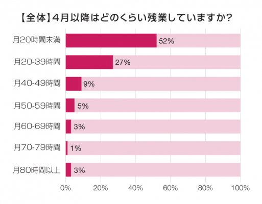 4月以降の1カ月あたりの残業時間の調査結果は、20時間未満(52%)、20-39時間(27%)、40-49時間(9%)、50-59時間(5%)、60-69時間(3%)、70-79時間(1%)、80時間以上(3%)でした。この4月に施行された「時間外労働の上限規制」では「年720時間(45時間以上は6カ月まで)」を上限と定めるなか、21%の会社員は月40時間以上の残業を続けていること、3%の回答者では、月々の残業時間が4月以降も80時間以上に達していたことが分かりました。
