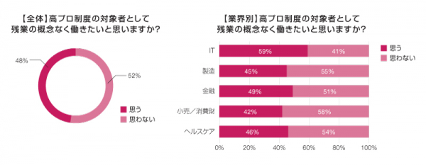 高度プロフェッショナル制度(労働時間規制の適用除外)について、現役の正社員に566人に「年収・職種など対象条件に当てはまれば、この制度のもとで残業の概念なく働きたいと思うか」を尋ねたところ、「思わない」(52%)が「思う」(48%)をわずかに上回りました。特に女性では特に支持の低さが目立ちました。業界別では、ITで「思う」が59%と、支持派が過半数を上回りました。