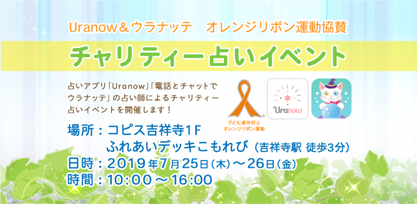 チャット占い Uranow(ウラナーウ)を運営するマリーシェル合同会社(本社:埼玉県さいたま市、代表:鯉沼寿慈)は、2019年7月25日(木)26日(金)の二日間、吉祥寺で子ども虐待防止のオレンジリボン運動の一環として『吉祥寺チャリティー占い夏祭りイベント』を展開いたします。