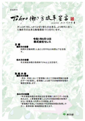 株式会社セレス(本社:東京都世田谷区、代表取締役社長:都木 聡、証券コード:3696、以下セレス)は、2019年6月12日に東京都が都内で事業を営む企業等の働き方・休み方の改善に向けた気運を高めていくために進めている「働き方改革の推進」において、「TOKYO働き方改革宣言企業」として承認されましたので、お知らせいたします。