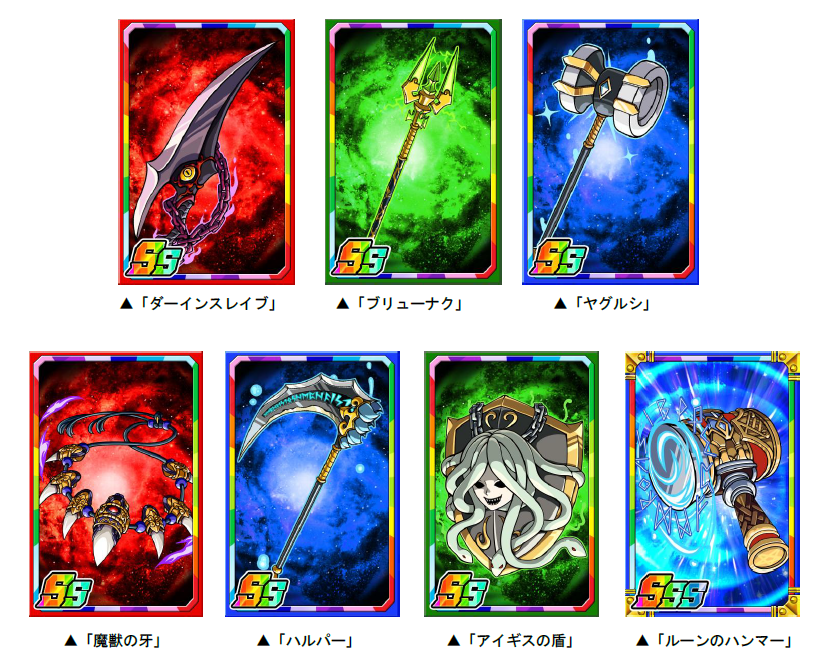 デュエルマッチ本戦に参加すると、1戦ごとに「デュエルメダル」が手に入ります。獲得したデュエルメダルは「デュエルメダル交換所」にて子分カード「ダーインスレイブ」「ブリューナク」「ヤグルシ」「魔獣の牙」「ハルパー」「アイギスの盾」、また、子分カード専用の進化素材として「ルーンのハンマー」などに交換することができます。デュエルメダルを貯めて、子分カードを手に入れましょう!