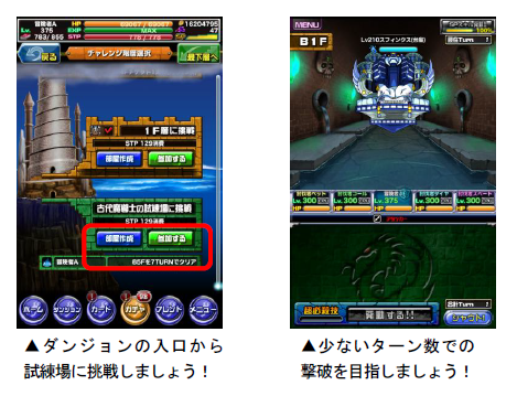 「古代魔導士の試練場」は、全6階層のダンジョンです。全ての階層にボスが出現し、ミッションクリアや宝箱などから、倒したボスのカードを稀に入手することができます。また、倒すのにかかった合計ターン数が表示され、それに応じた称号をもらうことができます。