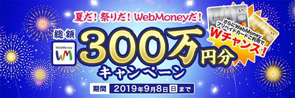 株式会社ウェブマネー(本社:東京都港区、代表取締役社長:田中 正信)は、“夏だ!祭りだ!WebMoneyだ!”「総額300万円キャンペーン」を2019年7月24日より開始します。