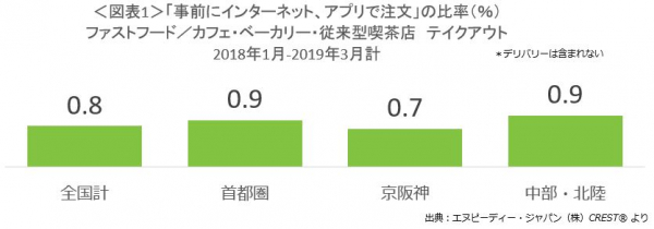 2018年1月~2019年3月におけるファストフード、カフェ、ベーカリーのテイクアウト利用時、インターネットやアプリからの事前注文比率は、全国計で0.8%でした(図表1)。事前注文を利用できる店舗が多いと考えられる首都圏においても、0.9%で1%未満でした。