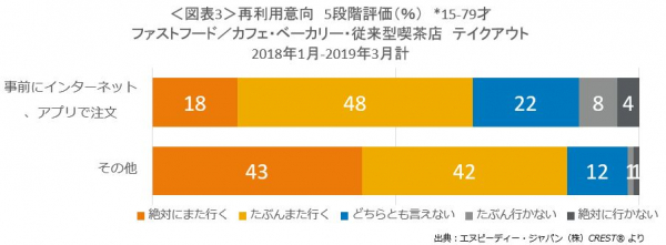 課題も浮き彫りとなりました。テイクアウト利用時の店舗再利用意向をみると(図表3)、アプリ/ネットからの事前注文利用時の再利用意向(絶対また行く+多分また行くの計)は66%で、その他の場合の同85%と比べ、19ポイントも低いことが分かりました。