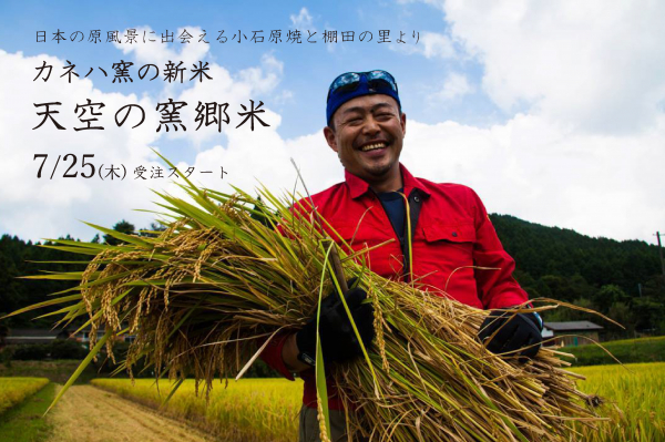 福岡県朝倉郡東峰村―標高500mの高原に位置し「天空の窯郷(かまさと)」と称される小石原(こいしわら)。この地で代々受け継がれた、器づくりと米づくりを生業とした「半陶半農」という生き方を実直に守る「カネハ窯」熊谷裕介さんが育てた新米「天空の窯郷米」をお届けします。予約は25(木)から店頭にて承ります。(WEBでのご予約は8月以降ご案内いたします。)