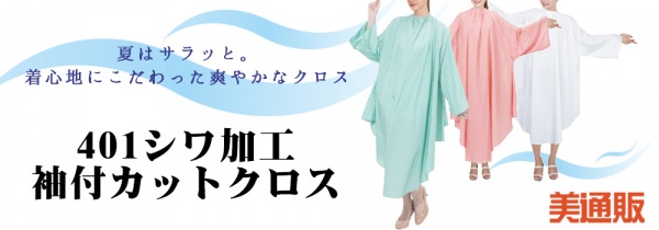 「美通販」では、「401 しわ加工袖付カットクロス」を、業界最安値を目指した美通販特別価格にてご提供いたします。増税前のまとめ買いにもオススメですので、この機会に多くのサロン様にご利用いただければと考えております。