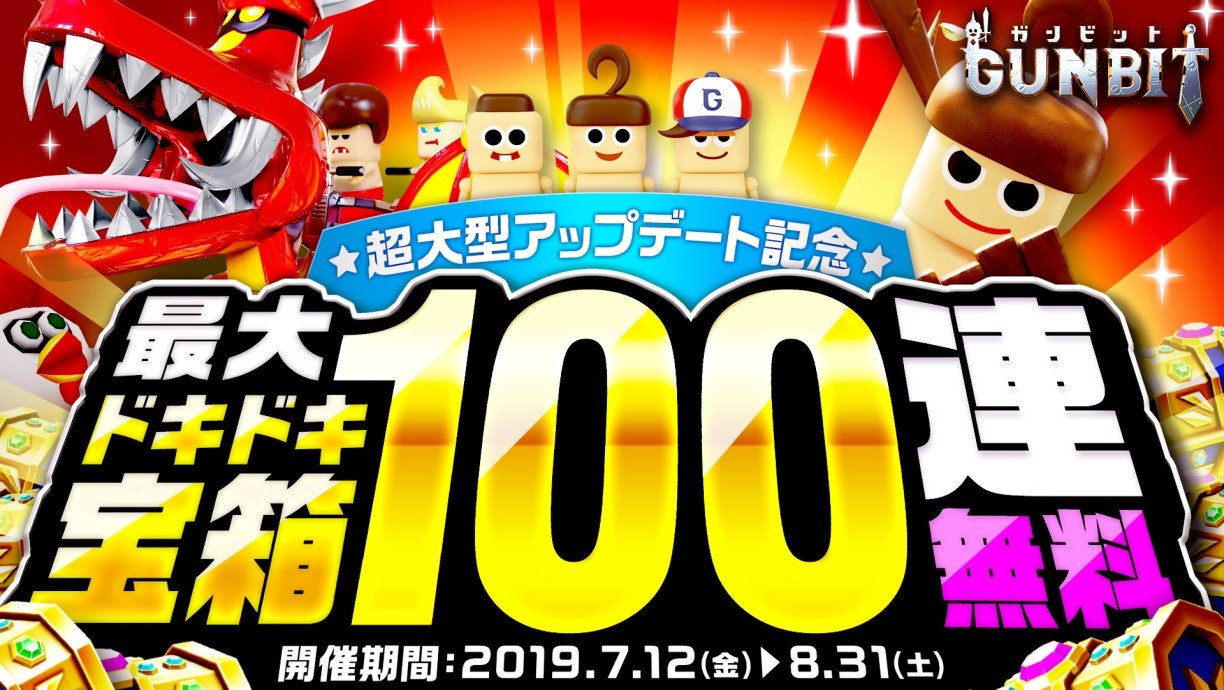 2019 年 5 月 15 日(水)よりサービス開始した『ガンビット(GUNBIT)』が、本日 7 月 23 日(火)に登録ユーザー数 70 万人を突破いたしました。日頃よりお楽しみいただいているユーザーの皆様へ心より御礼申し上げます。また、7月12日(火)から8月31日(土)まで、超大型アップデート実施を記念した、限定ビットやアバターなどが手に入る「ドキドキ宝箱」最大100連無料のキャンペーンが開催中です。