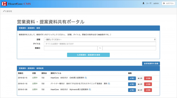 「SPA」と「HeartCore」が連携することにより、社内コンテンツを集約したポータルサイトを、ノンプログラミングで構築できます。社内ポータルサイトから社内文書を格納したり、検索したりできるようになり、社内文書を一括管理することが可能になります。
