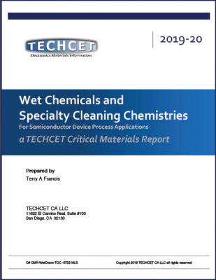 テクセット社(Techcet)が出版した「半導体製造向け湿式化学品 (ウェットケミカル)と洗浄用薬品 - Wet Chemicals and Specialty Cleaning Chemistries: For Semiconductor Manufacturing Applications」は半導体工程で使用されているウェットケミカル(液体化学薬品)と洗浄剤市場を調査し、市場概況、サプライヤー情報、技術動向などについて詳細に調査・分析した結果を提供しています。