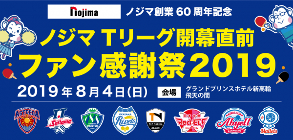 ノジマTリーグとして2年目となる2019-2020シーズンが2019年8月29日(木)に開幕いたします。当日は、Tリーグ松下チェアマンに加え、開幕直前の選手達が登場し、シーズンに向けての抱負やトークショーのほか、記念撮影、抽選会、選手とのラリー体験など、ファンと選手の交流を深められるイベント内容となっております。 Tリーグファンの方はもちろん、最近子供たちにも卓球人気が高く、お子様連れのご家族などの夏休みのイベントとしても、ぜひご参加お待ちしております。