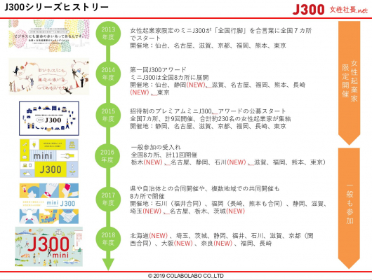 国内最大級の女性経営者データベースサイトを運営する女性社長.net((株)コラボラボ企画・運営 本社:東京都千代田区 代表取締役:横田響子)は、2019年度で11回目を迎える女性起業家の祭典「J300」にて、全国各地域でのイベント「ミニJ300」、「プレミアムミニJ300」を開催する15地域と、各地で共催運営する「J300地域アンバサダー」である女性起業家を、2019年7月25日に発表いたしました。