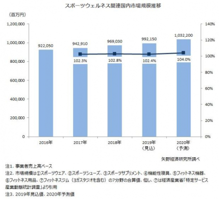 スポーツウェルネス関連国内市場規模は、2019年に前年比102.4%の9,921億5,000万円、2020年には同104.0%の1兆322億円と拡大推移を予測する。