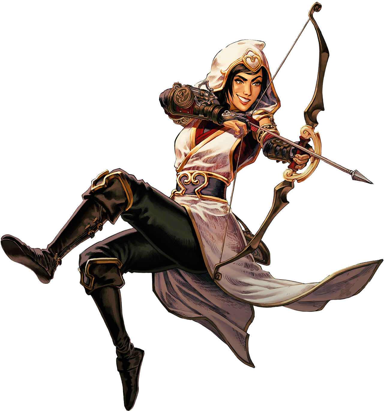 弓矢を使った用いた遠距離攻撃が得意。引っ掛け鉤を使うことができ、ワイヤーで体を振り子のように動かして勢いをつけ、谷間を飛び越えたり、素早く移動したりできるのも特徴。