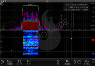 2. 無線周波数ごとの電波強度を表示するスペクトラムグラフ、およびそのスペクトラムグラフを時系列に記録表示するウォーターフォールグラフをサポートしています。