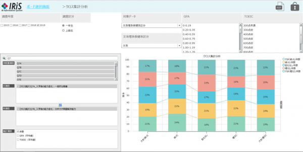 加盟大学においては、煩雑なデータ登録の改善や集計処理の高速化により担当者の工数削減が期待できます。また、各校独自の視点で集計軸を設定し、クロス集計を行うなどより深い分析が可能となり、新しい「IRiS」が教育の質の向上を支援します。