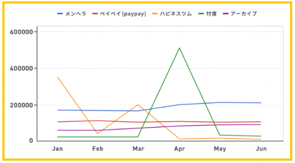 グラフを見ると、「メンヘラ」や「paypay」「アーカイブ」は安定した検索ボリュームがありますが、「忖度」についてはこのワードについて多くの報道がなされた期間で検索ボリュームが急激に増えていることがわかります。話題となったニュースに関連するワードは、瞬間的に多くの注目を集めることがわかります。