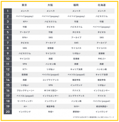 「メンヘラ」が各主要都道府県すべてで1位となりました。このワードは全国データでも1位であり、いかに全国的にかつ継続的に注目されているワードであるか、ということがわかります。ちなみに「メンヘラ」は2018年の「ネット流行語」で第26位にランクインしています(『ネット流行語100 2018』より)。数年前からネットの中では注目を集めていた言葉が、全国に徐々に広がっていったといえます。また、他ワードの4都道府県別のランキングをみると、顕著に地域差が現れたのは、東京都と北海道でした。特に東京では、他の地域にはランクインしていない「KPI」「RPA」「ICT」「マーケティング」といったビジネスシーンにおいて使用するワードが上位にランクインしています。これらのワードが他の3地域ではランクインしていないのが特異的です。また、北海道では、「PM2.5」への関心が高い結果となりました(「PM2.5」は他3都府県では200位以降)。