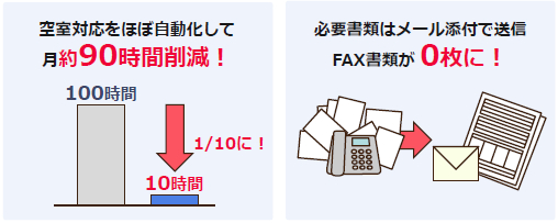 今回のリニューアルで、本サイト上でそれらすべての業務が完結するようになります。これにより、空室確認や内見予約の電話の90%、内見予約時のFAXのほぼ100%のカットを見込んでおり、大幅に業務効率が改善します。