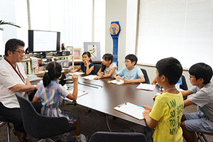 社長室にもヒアリングに行き、子どもたちから「社長の仕事は何ですか?」と問われた代表の永吉は「いい質問。僕の仕事は次にどんなことをやろうか、と考えることです」と話し、子どもたちも熱心にメモを取っていました。ほかにも「KDLはどんな会社へ成長するのですか?」「この仕事をやっていてよかったと思うのはいつですか?」といった質問もありました。