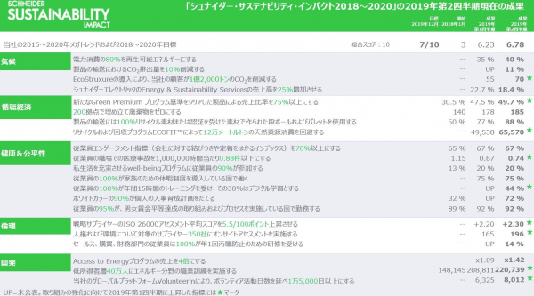 エネルギーマネジメントおよびオートメーションにおけるデジタルトランスフォーメーションのリーダーであるシュナイダーエレクトリックは、5年目となる2019年上半期の決算資料および決算補足資料を発表しました。当社は、持続可能性に向けた積極的な取り組みの進捗を評価する「シュナイダー・サステナビリティ・インパクト2018~2020」にある21の指標を四半期ごとに公表しています。これは、COP21および国連の目標に沿ったものです。2019年第2四半期の総合スコアは6.78/10となり、2019年末のシュナイダー・サステナビリティ・インパクト目標である7/10を達成できる見込みです。