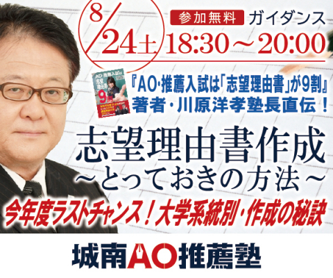 株式会社城南進学研究社(本社:神奈川県川崎市、代表取締役社長:下村勝己)が運営するAO・推薦入試対策専門塾「城南AO推薦塾」は、AO・推薦入試における「志望理由書」作成のポイントについて解説するガイダンス「志望理由書作成~とっておきの方法~」を2019年8月24日(土)に開催します。