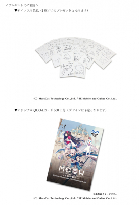 今回は、キャラクターボイスをご担当いただいたキャストの方々のサイン入り色紙と、「MEOW」オリジナルクオカード500円分を、計120名の方にプレゼントいたします。