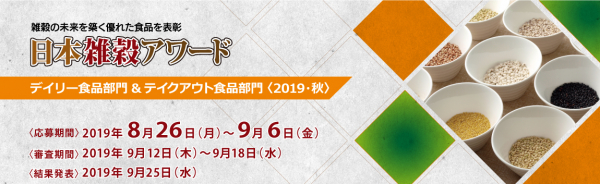 一般社団法人日本雑穀協会(会長/倉内伸幸 日本大学生物資源科学部教授)は、雑穀を使った優れた食品を表彰する制度、日本雑穀アワード デイリー食品部門&テイクアウト食品部門〈2019・秋〉において、8月26日(月)~9月6日(金)の期間、商品エントリーの受付を実施いたします。